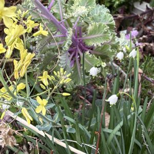 こんにちは😃🎶 4/4大阪19℃/15℃雨時々止む 今日のお花 スノーフレークさん 葉牡丹の黄色のお花と 仲良く咲いてます💕