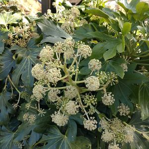 【八手】《ウコギ科》 💠今日のお花💠 ヤツデの花は、 同じ花が「雄花」から「雌花」へと 性転換する「雄性先熟」という 特徴を持ち、 自家受粉を避ける戦略です。 咲き始めは白い雄しべが目立つ雄花で、その後雄しべが落ちて雌しべが伸びて雌花になり、 昆虫が花粉を運びます。 花序全体が 「雄性期」から「雌性期」へと 時間差で変化し、 長い期間花を咲かせ、 冬の昆虫に蜜を提供します。