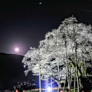 しあわせの🩷めっけもん 4月2日 薄墨🌸とピンクムーン🌕の夜景 ついでに上に光るものがマップス彗星🌠だったら嬉しい😍 3月29日の昼間の鮮やか🌸。 その後の☔もあり、もう、散っているかと思いましたが今夜しか月🌔と🌸の競演は見られそうもないと🚙を走らせました。 樹齢1500年の🌸は美しく散ることをたえて凛としてそこにありました。 ピンクムーンと、マップス彗星?嬉しい光の競演だと思いたいです🌠🌠✨ 5枚目は薄墨桜と薄墨桜2世の間の月です。