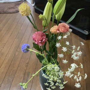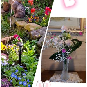 今晩は🌙😃❗ 今日も1日お疲れ様でした。(*⌒∇⌒*) 雨☔も 午後からは上がり 晴れ間☀️も 先日 頂いた花籠の整理を枯れてないお花を花瓶に生けました。🌼🌼 小さな庭のお花も ギボシの葉芽や山吹も開花して ひなたちゃんも 😻も嬉しいそうです。🤗💞