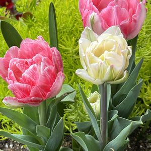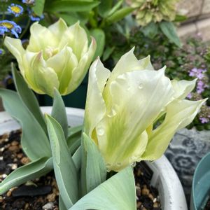 今朝の庭より ꕤ チューリップ スプリンググリーン ꕤ 先日投稿したフォクシーフォックストロットに続きこの子も花茎が伸びずに咲きました😆 3枚目が先日投稿した子🌷 黄色1色だったお花が色変わりして来ました💓 花茎は伸びないままです🤣