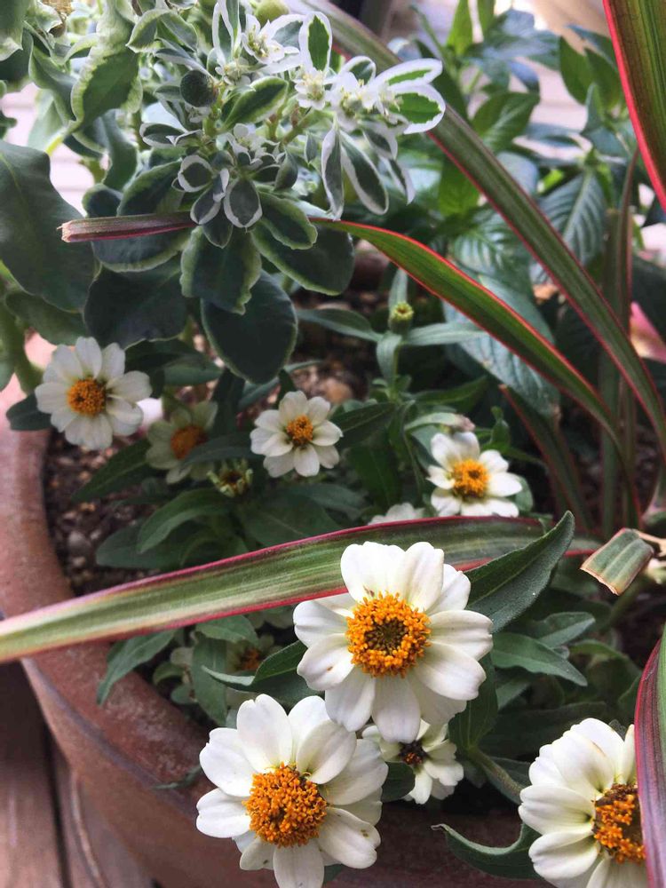 小さなジニアさん、強い風が吹くベランダに向いてるかもと寄せ植えにしました。