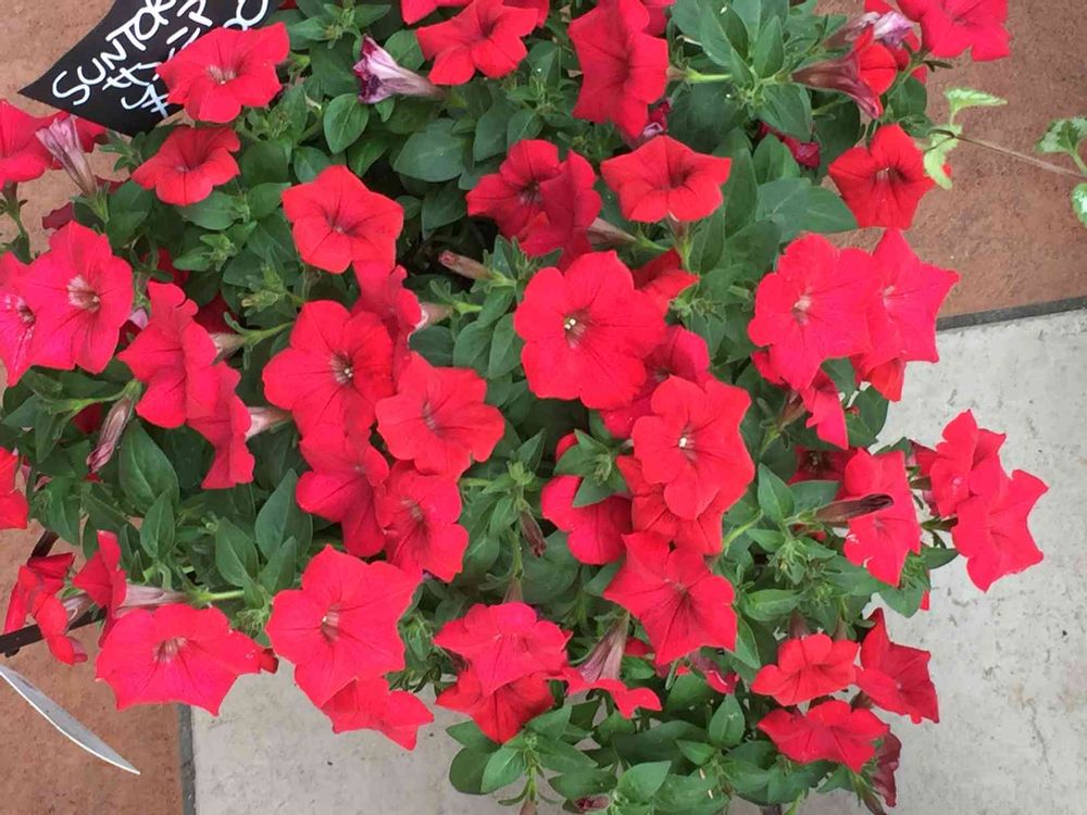 近所のお店で売っていたサフィニアです。紫や青もだけれど、赤もやはりかわいい花ですね。