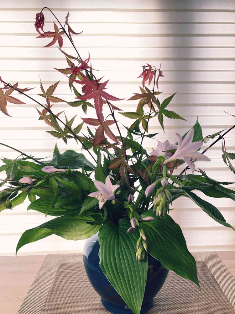 ギボウシの落ち着いた色合いに、上の方でもみじの赤が華やかで良いですね☺️