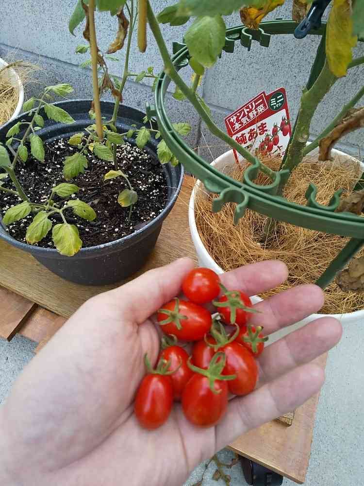 とりあえず明日からまた雨なのでミニトマト(純あま)収穫しときました😆左側の鉢は右のミニトマトの脇芽を育成中です😁