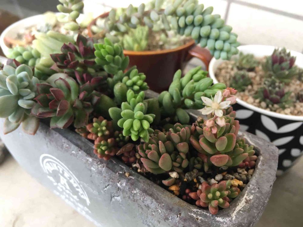古い多肉さん達と一緒に寄せ植えした新入りさんも花を咲かせてくれました🌼🎶