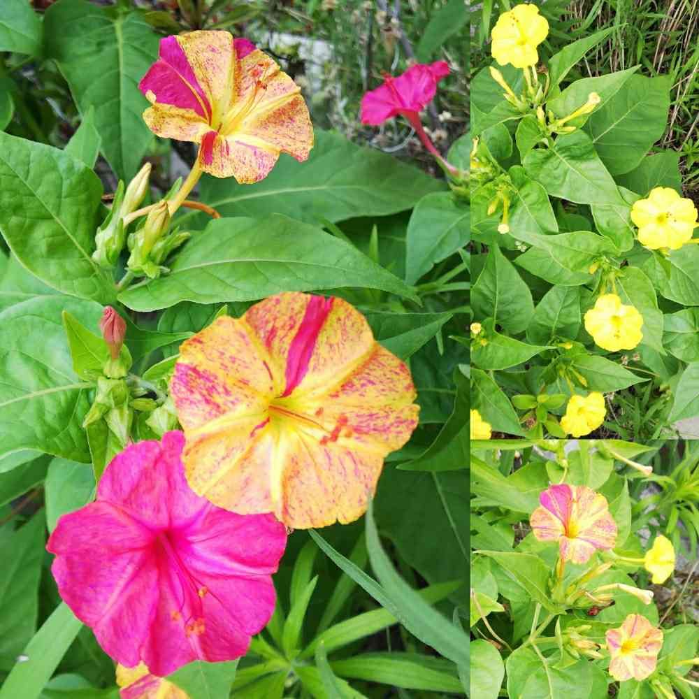 ピンクや黄色の咲く中に、まだらになった、オシロイバナ🥰(絞り咲き・・・何だかオシャレな表現💓)
