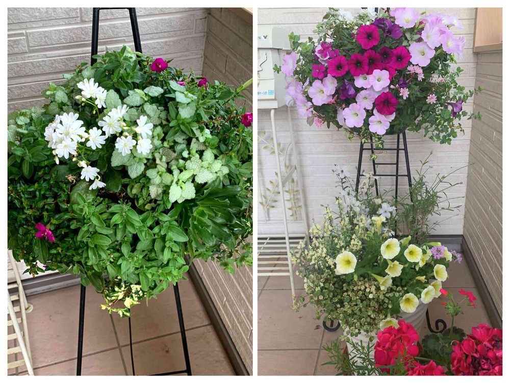 ペチュニアのハンギングバスケット。ピンチ中です。開花したらどんな風になるかなぁ。