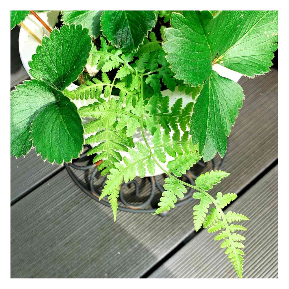 イチゴの鉢のシダが成長してきて なんか可愛くてど〜しよ〜か悩んでいる🌿💦