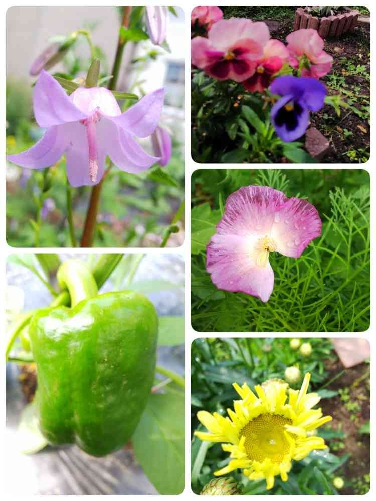 ハタザオキキョウやっと咲きだしました🎵パンジーに紫が💜野原の種開花第3号はまたまたハナビシソウ😄今度はピンク💗でも、降り続いた雨のために、花びらが😅もう1つのシャスターデイジーは咲くと白になります😊赤のカラーピーマンはまだまだ緑💚