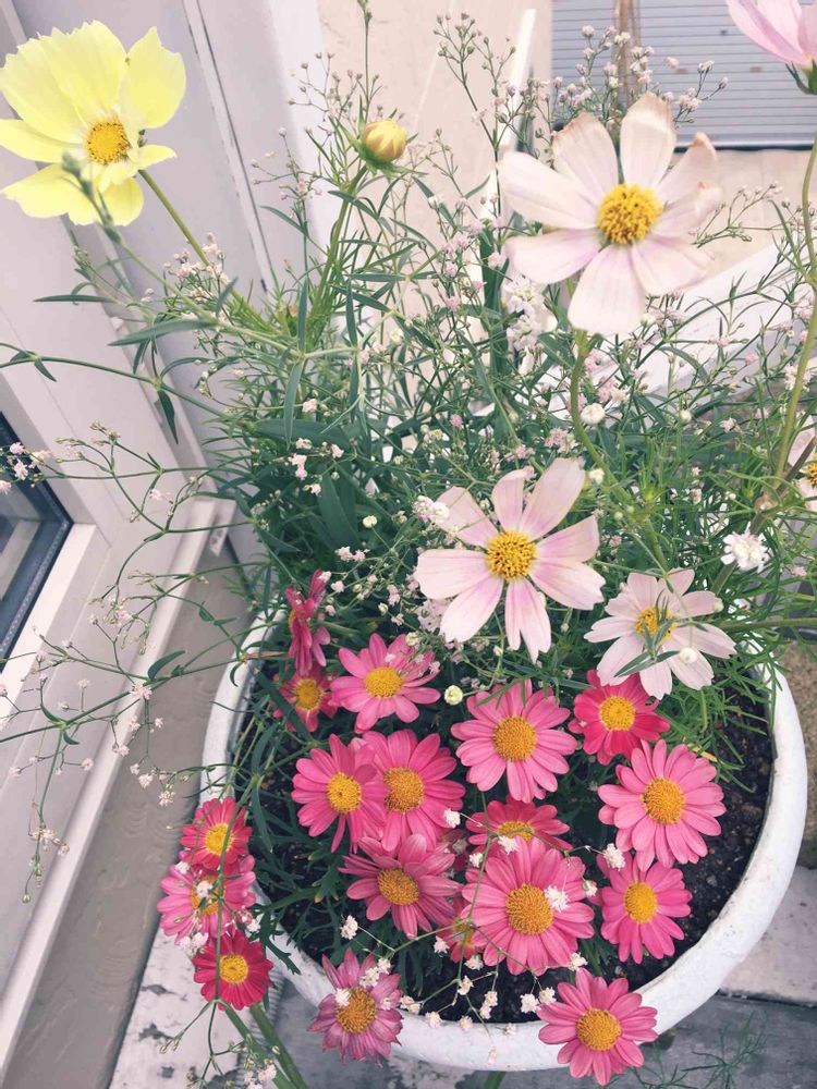 寄せ植え変えてみた☺️やっぱりこの方がいい感じ😚黄色苦手だけど透きとおる黄色いコスモスに一目惚れ😍ピンクコスモスもくすんんだ感が好き❤️かすみ草いれたら花束みたいな寄せ植えでかわいい😍😍
