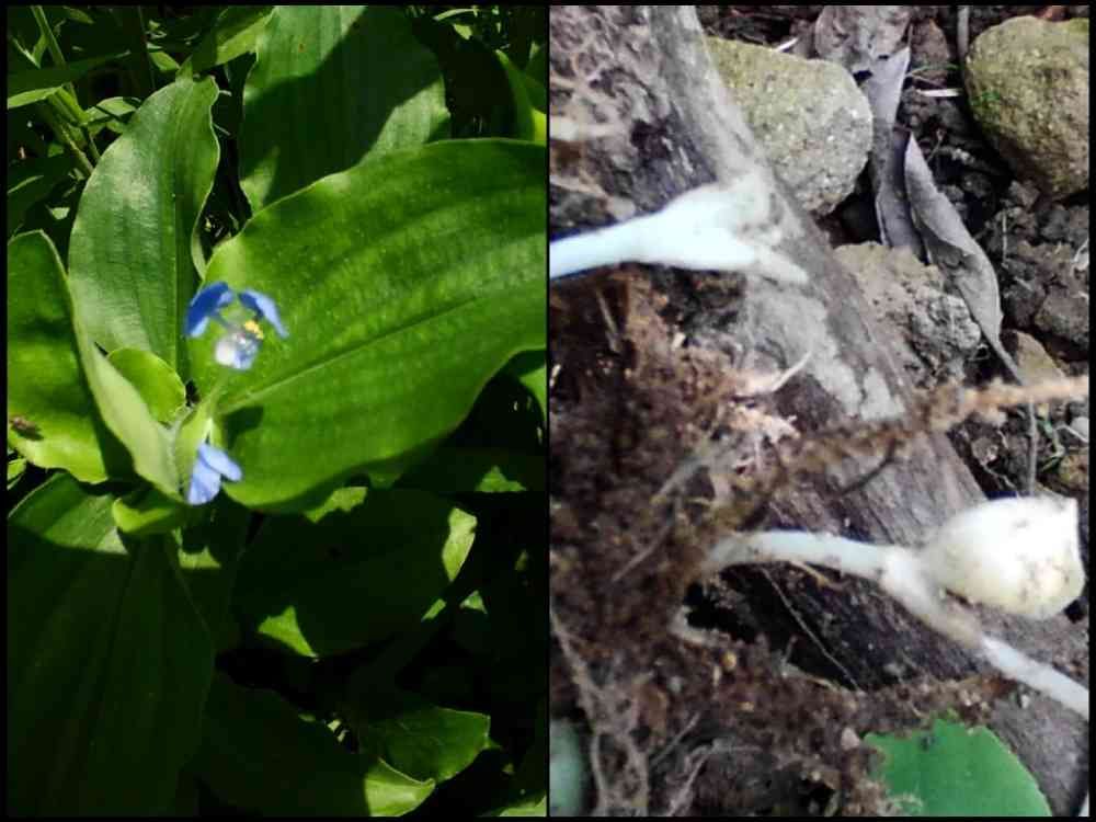 右pic 花の付いて無いのを土を壊してそっと抜いたら閉鎖花があります、これが原因ですね、地上の花が咲いて種が出来ん内に抜いても、もう地下に子孫を残して居るのですね。地上の花は遺伝子の多様化、分布域を広げる為ですね。🌸はツユクサの半分位の大きさ、上弁(内花被)は丸くて柄があります。