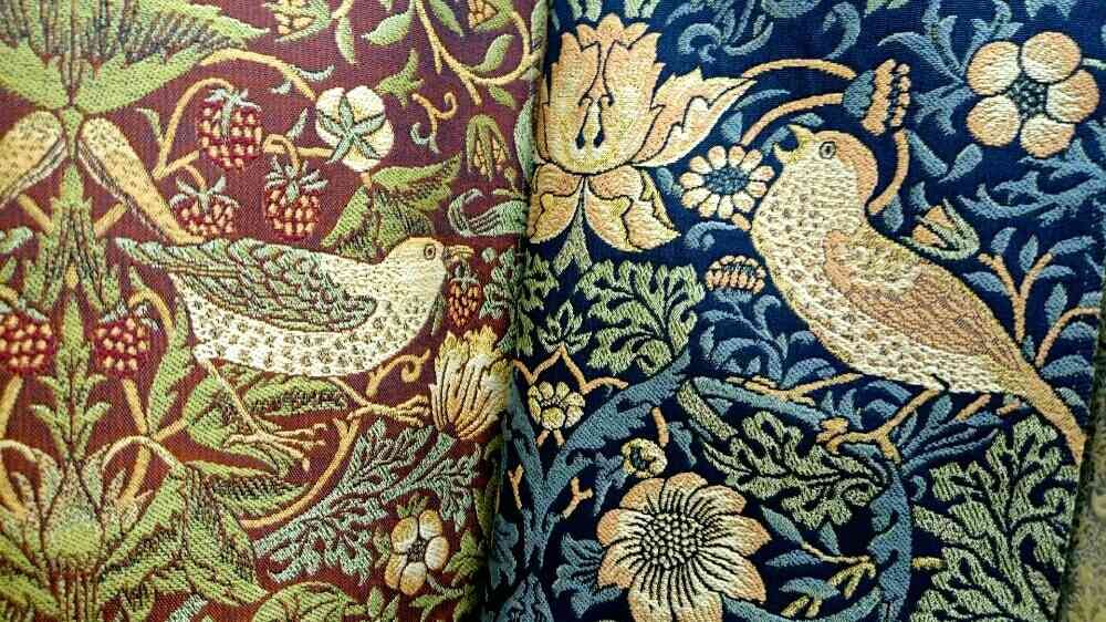 ウィリアムモリスの「苺どろぼう」。1800年代の図柄が、いまに生きてカーテン生地として、販売されています。織りは京都産。丁寧な仕事、高級なお品でm¥12,800!