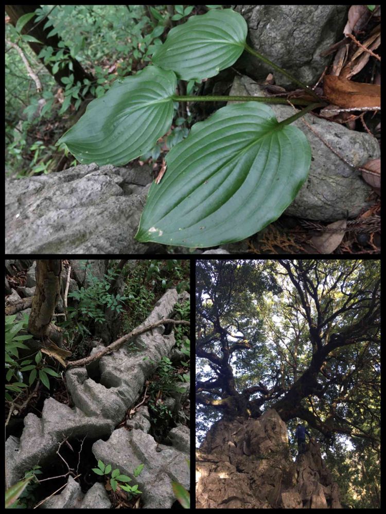 (上)石灰岩とギボウシが良くお似合い。結構な大株なのに葉っぱは3枚か、、もっとリスク分散を図ったほうがいいのに、と余計な心配。