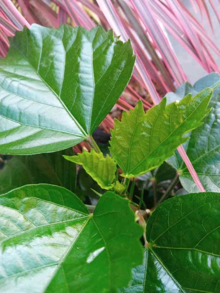 ハイビスカス、他の植物に水やりして振り返った拍子にお尻で新芽のところを折ってしまった😓