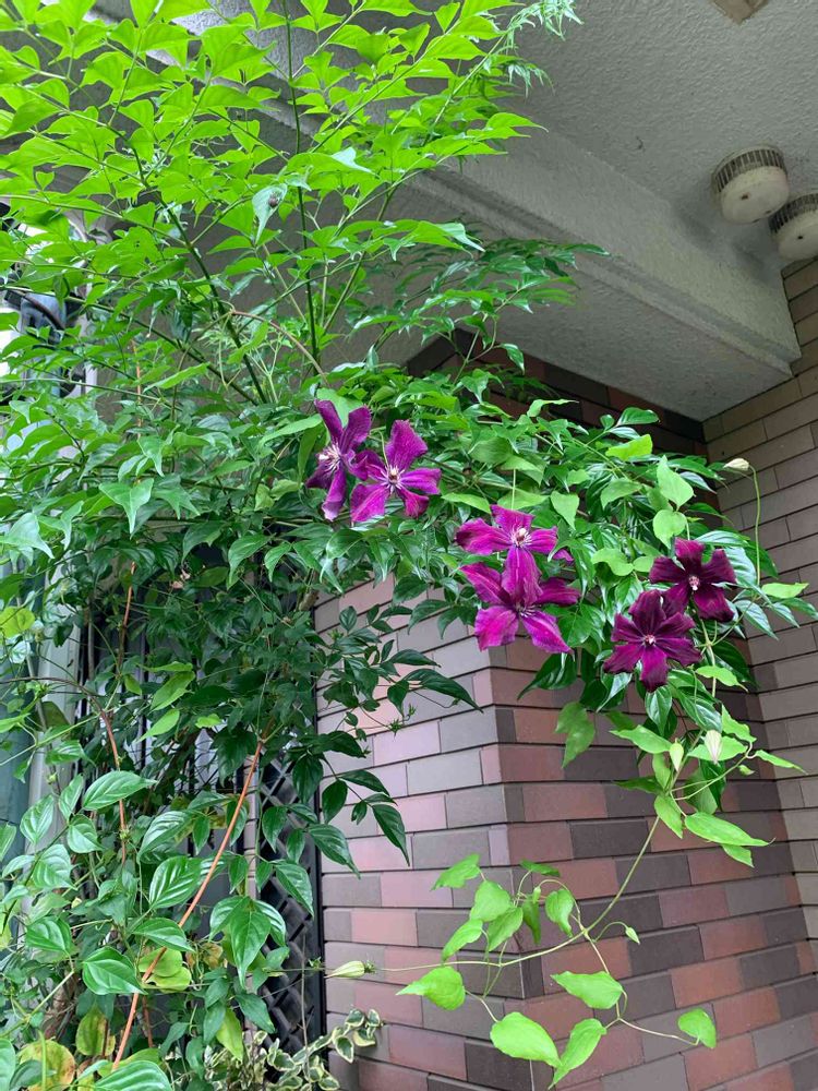 背が高くなりすぎたシマトネリコは低くしてしまおうか‥といつも思っていますが、前に置いたクレマチス の鉢から、5月にはリトルバスが、6月にはこの赤紫のクレマチス がシマトネリコの葉にツルを絡ませながら登っていくので、なかなか切れません😅