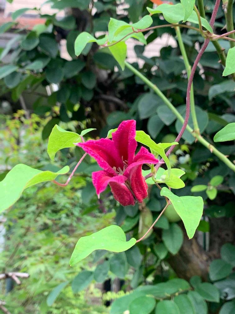 こちらは、赤いバラの🌹ダイナマイトと一緒に咲くことを期待してアーチにはわせていますが、つぼみの期間が長くてやっと開いたら、ダイナマイトはほとんど終わっています😅切れ込みのしっかり入った色もステキなクレマチスですが、つるも赤くて葉の形も独特で気に入っています。ミソはツルを2メートルくらい伸ばさないと咲き出さないことです。クレマチス って深いですね☺️