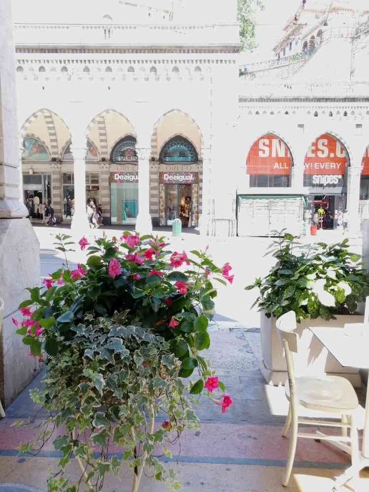 ジェノヴァの中心街のアーケードとバールに飾られたお花達🌺
