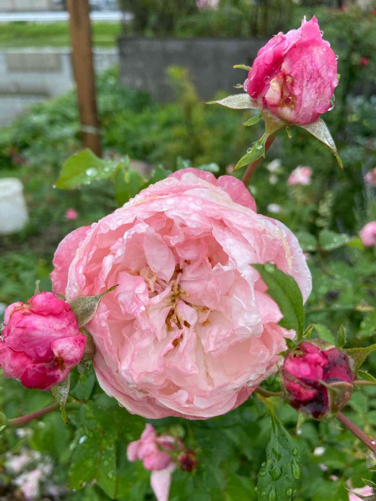 雨で、花びらが、崩れるのを、周りの蕾たちが、守ってます。