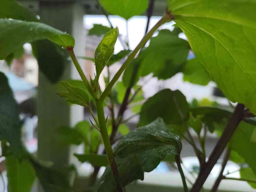 ローゼル若い芽に透明のつぶつぶ が沢山ついてる。