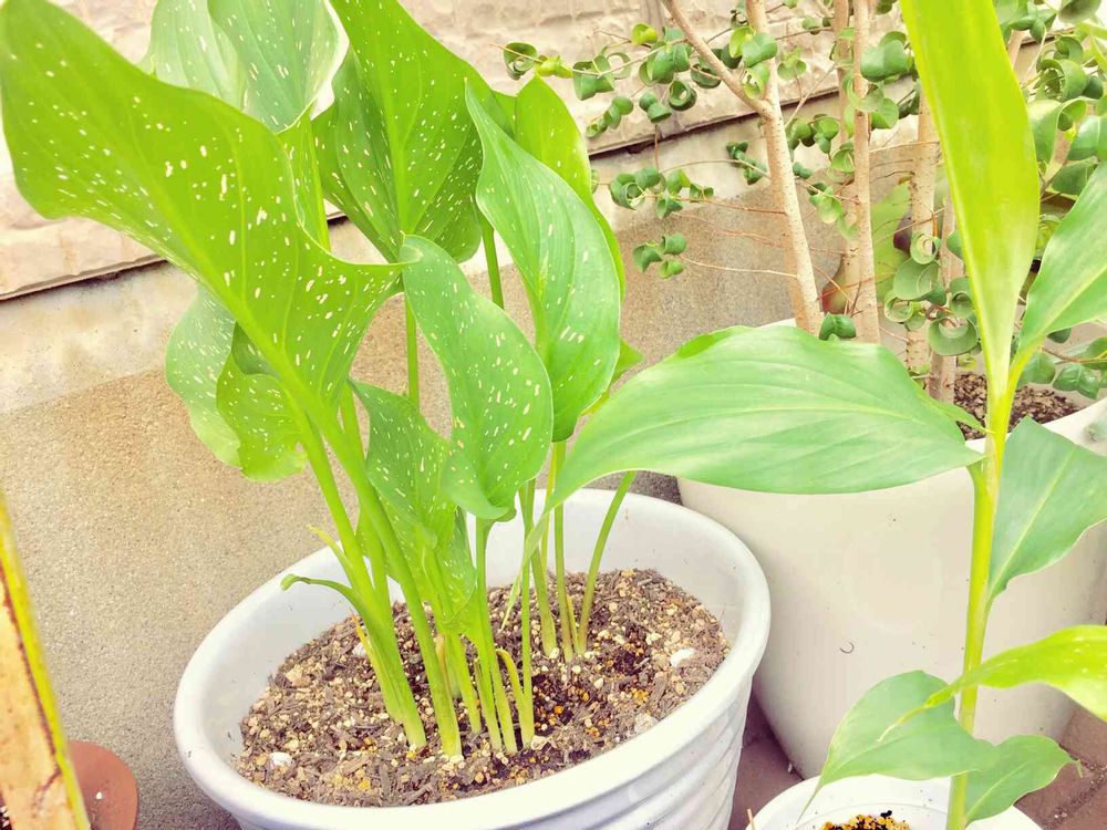 左 1か月ほど前にジンジャーの球根を植えましたと報告したけど、この葉っぱはどうみてもカラー黄色でした。😅
