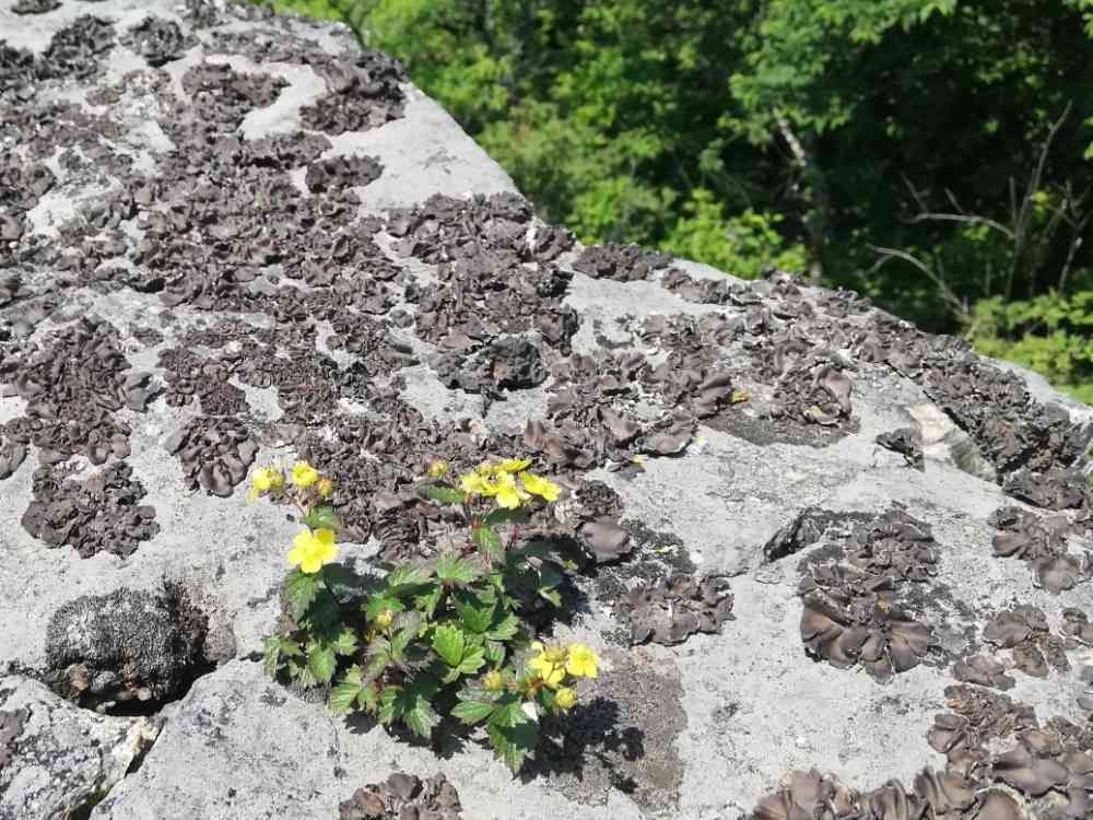 下北半島の縫道石山頂に咲いていました、可憐です、周辺のグレーのヒダみたいなのは天然記念物のオオウラヒダイワタケ、氷河期の生き残りだそうです、標高626m、黄色の花おねがいします、