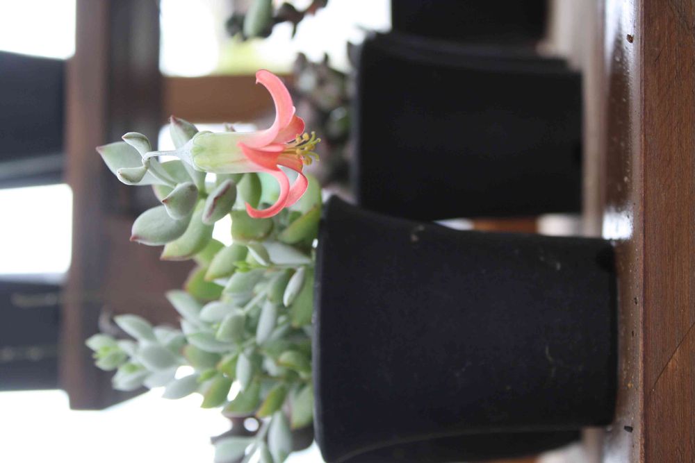 雨のそぼ降る梅雨の日、多肉植物に水やりしていると、コチレドン・ペンデンスに花が咲いているのに気が付きました。