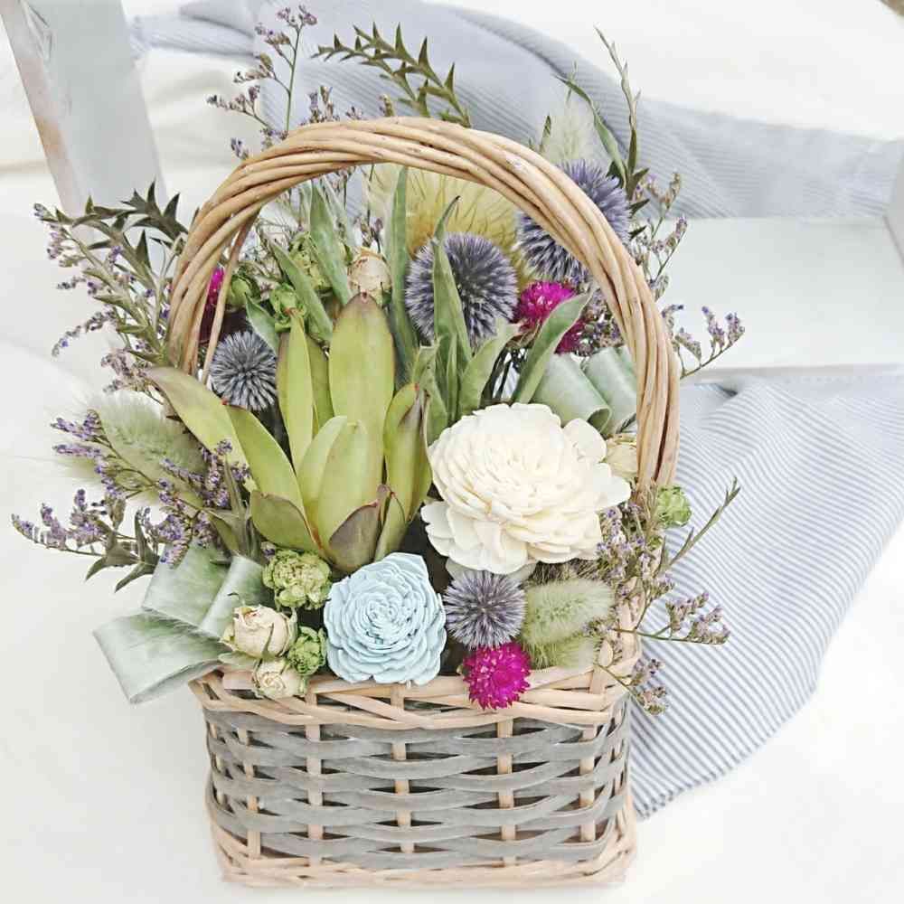 リューカデンドロン、フィリカ、グレビレアなどのネイティブフラワーとルリタマアザミの夏のバスケットアレンジ。
