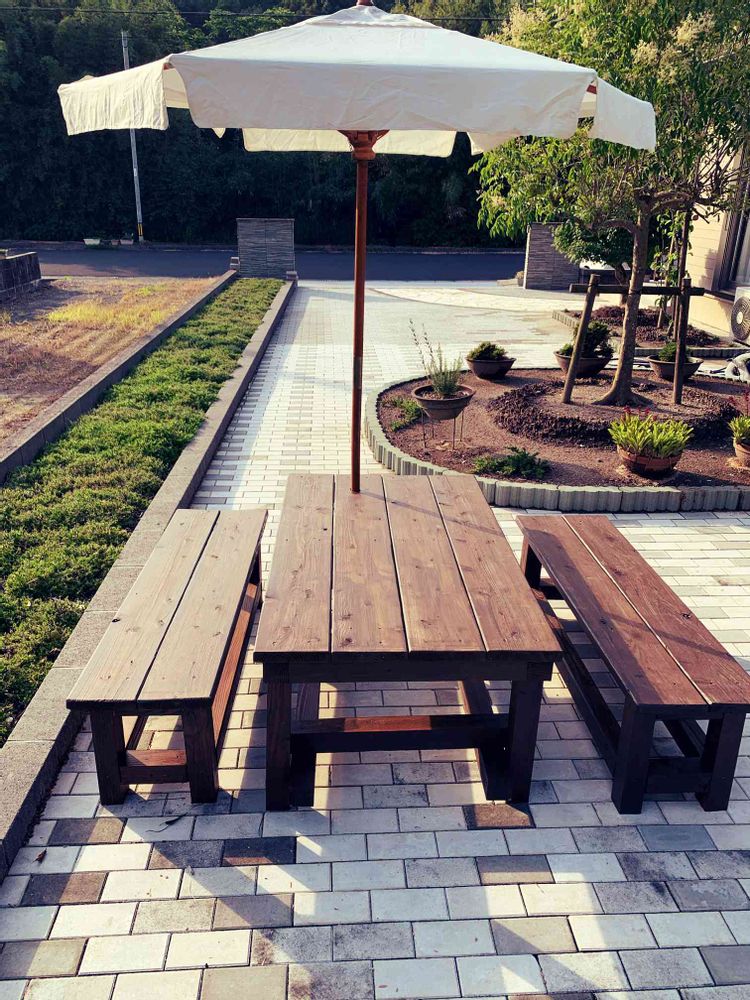 今日の昼から雨が止んだので、この間の続きで、テーブルに日除けのパラソル⛱を付けて、やっと完成しました〜😉🎵