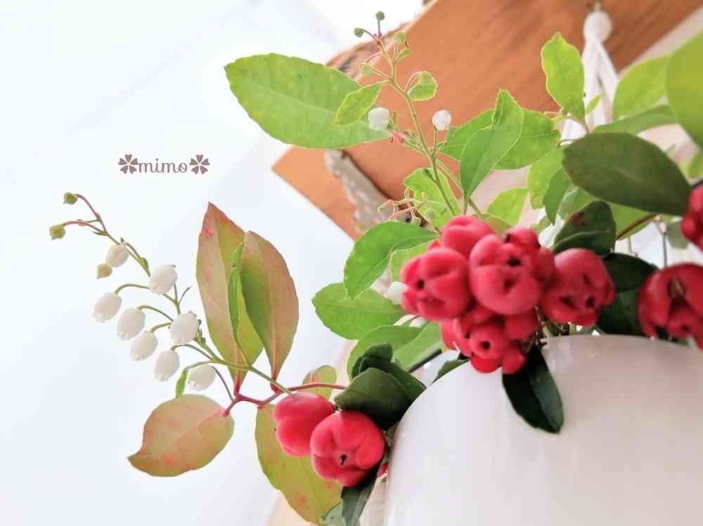 🍒は冬からずっとついたまま🌿、全然落ちないので大丈夫かな~(^^;)と思いながらもお花と一緒に楽しんでいます🎶