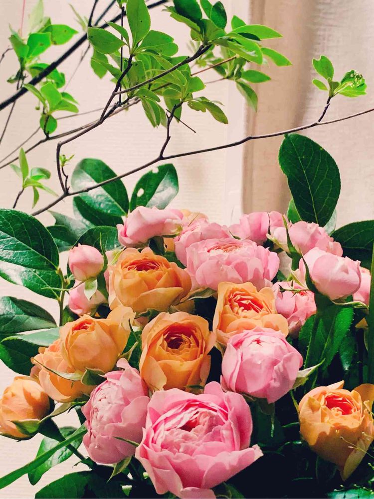 ピンク💗とオレンジ🧡色のバラと、シャラシャラしたなんらかの葉っぱの組み合わせ。