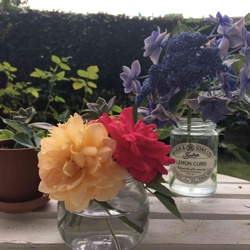 マンションの小庭とテラスで鉢植えのバラを中心にお気に入りの植物を育てています。