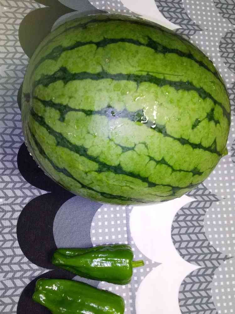やっと小玉すいか、花が咲いて実が出来てから、30日以上経って叩いたら、多分いい音がするので、試しに切ってみました〰️💖普通のピーマンと比べて撮りました📷️