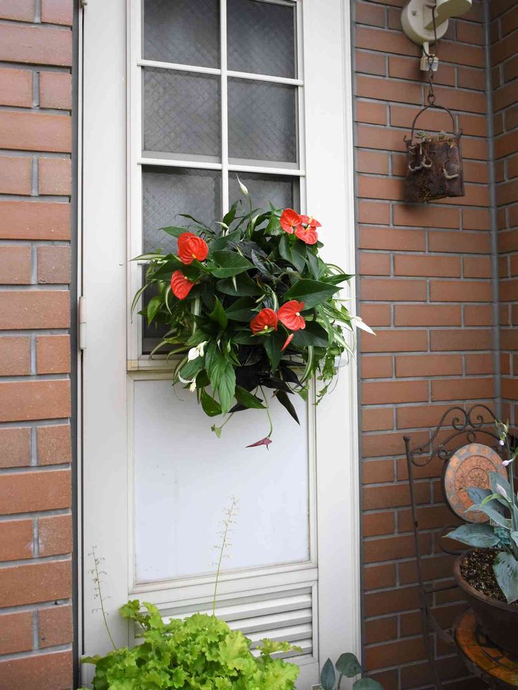 このドアはめったに開けないのでハンギングバスケットを飾っています。