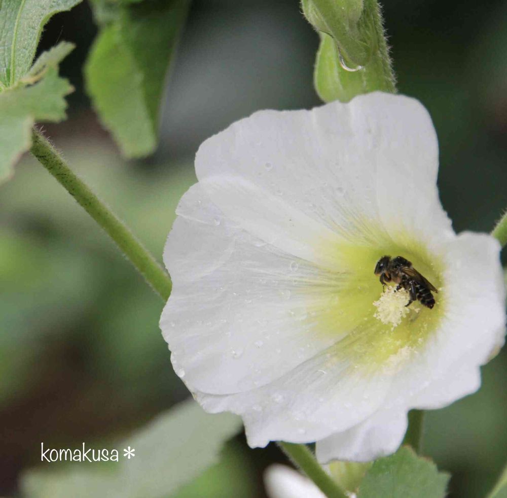 また降り出した雨にタチアオイの大きな傘の下で雨宿り🐝ここなら食事にも困らないね✨