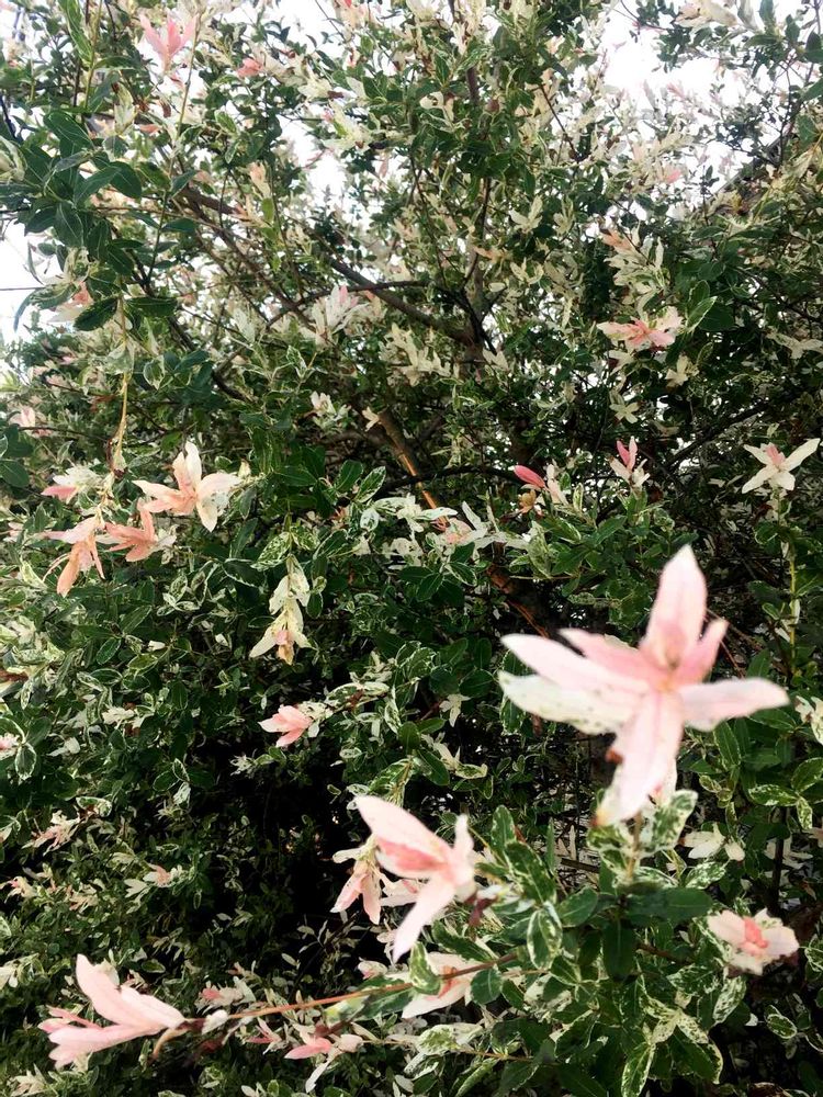薄いピンク色は、花ではなく新芽なんです。この庭木の魅力は、葉っぱの色合いの変化。段々白くなって7月には緑に変わるとか…。7月にまた通ってみたいですね。
