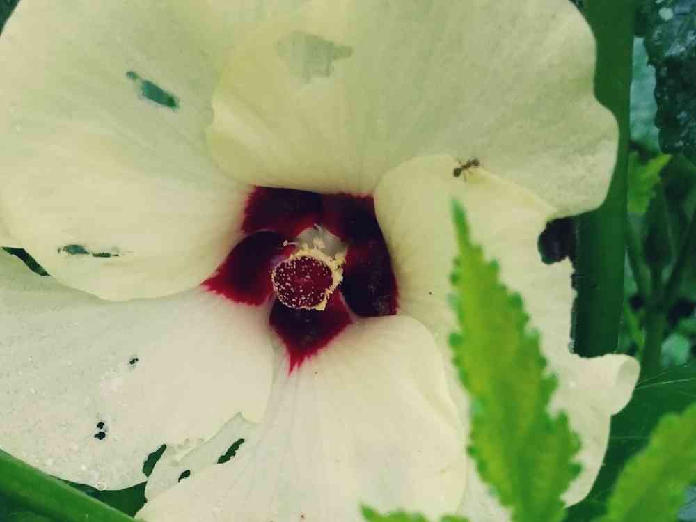 オクラの花が咲きました。雌しべを求めて、アリンコが次々に遊びに来ていました❗️
