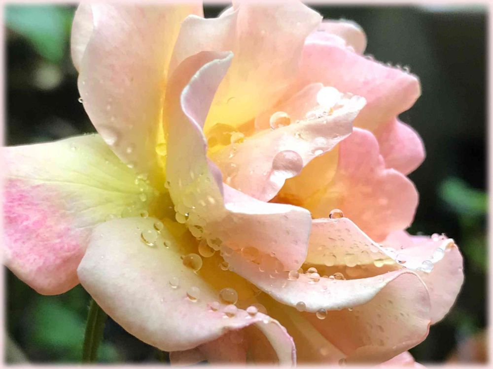 優しい、黄色とピンクに、透明のしずくが、宝石みたいで、バラって本当に、素敵ですね〜