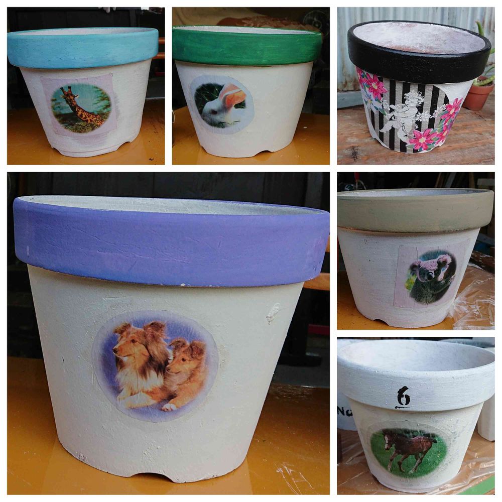 草花用に素焼き鉢8号で、珪藻土/漆喰を塗り、紙を貼りました。