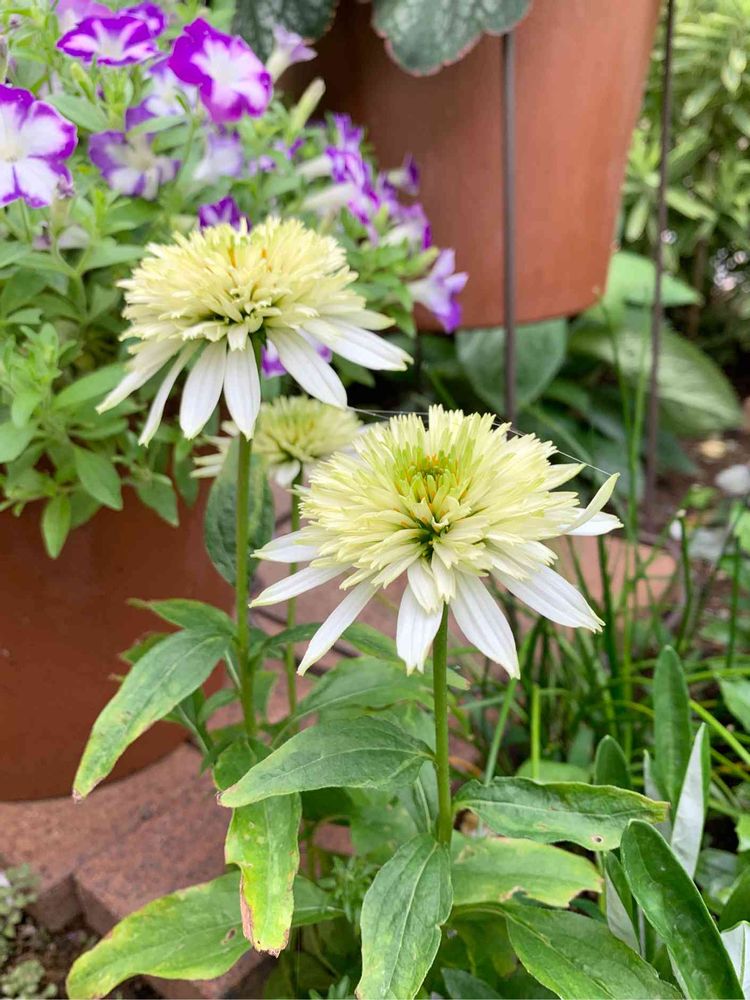 白いエキナセア、清楚でステキですね!サフィニアの紫の縁の色もとっても涼しげ🎋