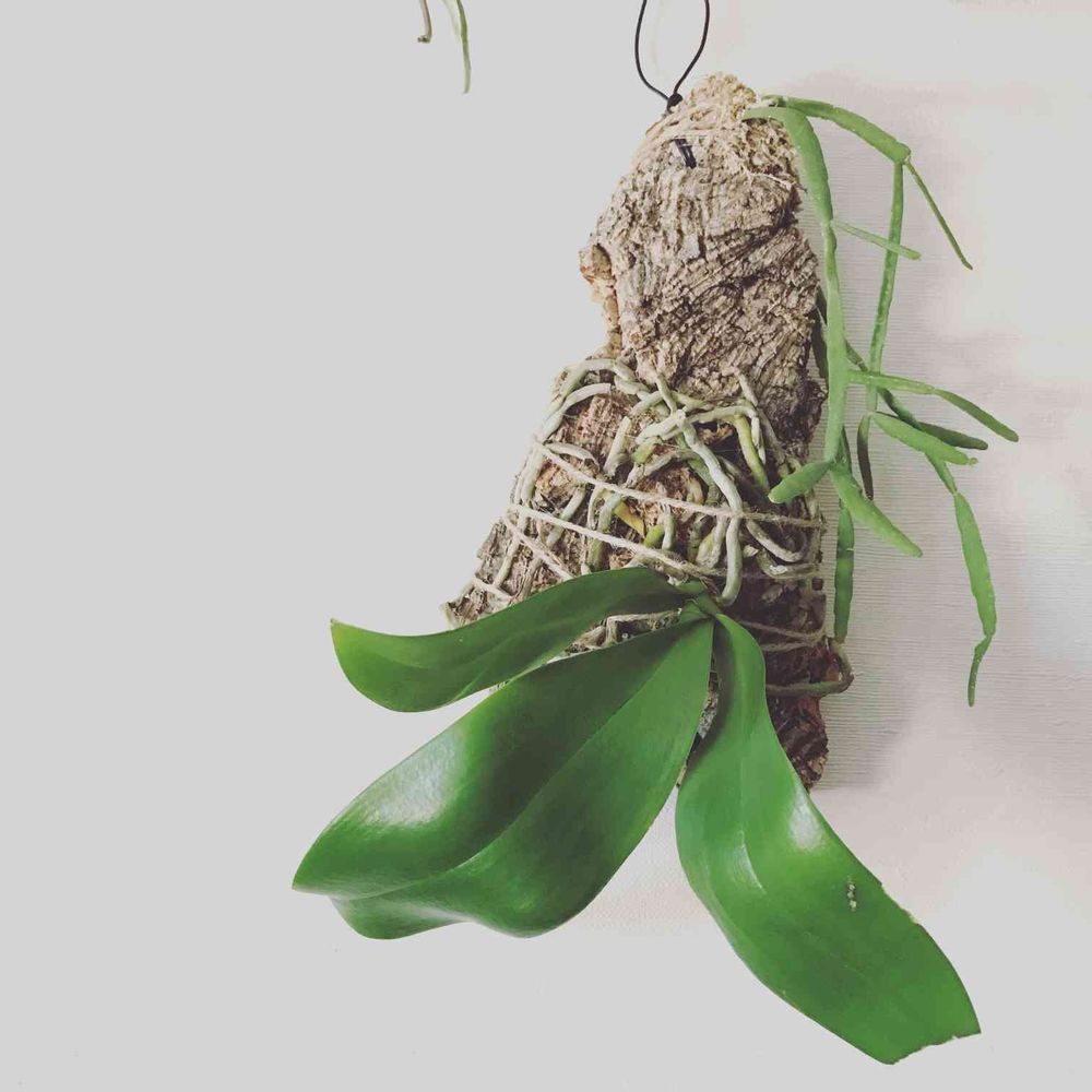 板付にしてたドリナリアの調子が落ちたので、鉢に戻して様子見してまして、そこに付いてたリプサリスを流用しました。ドリナリア板の時は根元の水苔が多すぎてコルクに根が届きそうになかったので、今回は根をコルクに付けてから根元を水苔で覆ってます。着くと信じて😆