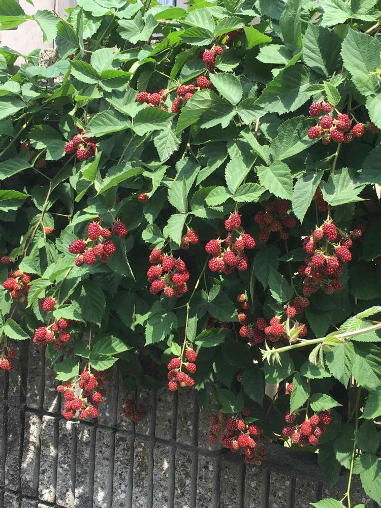いつも通る道 ブロック塀からブラックベリーが垂れ下がってます。