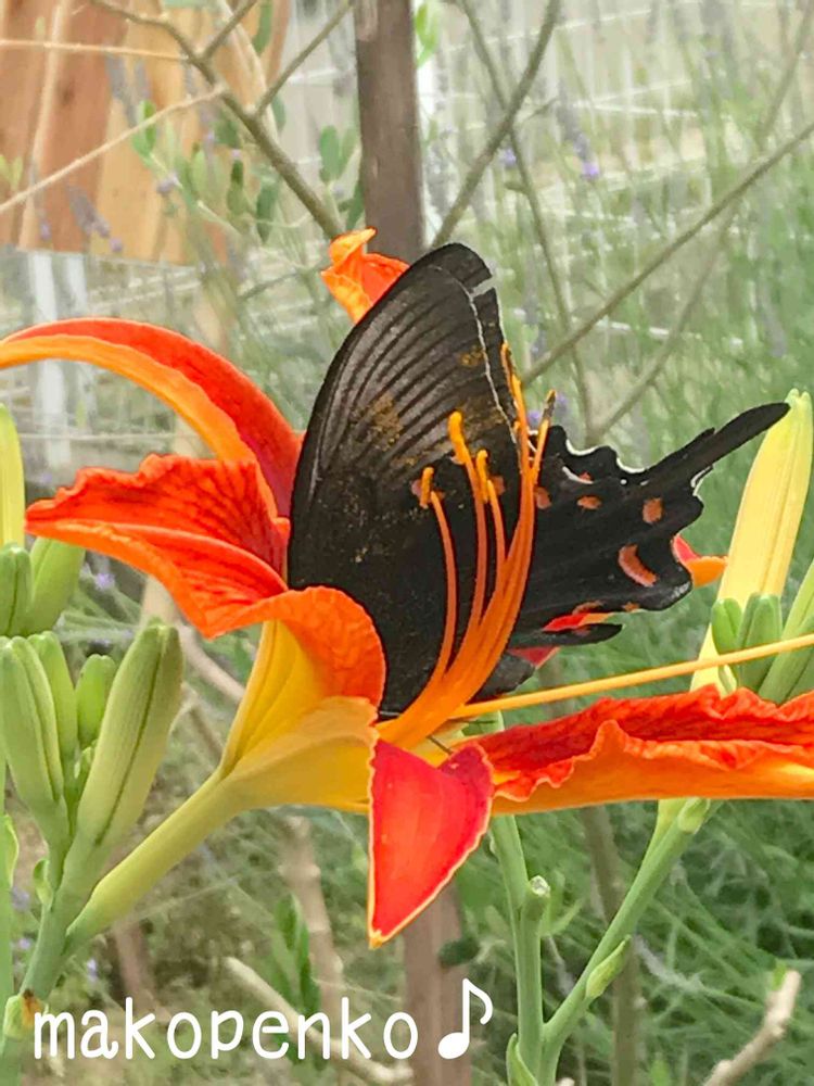 ヘメロカリスにアゲハ蝶が蜜を吸いに来ていました💕