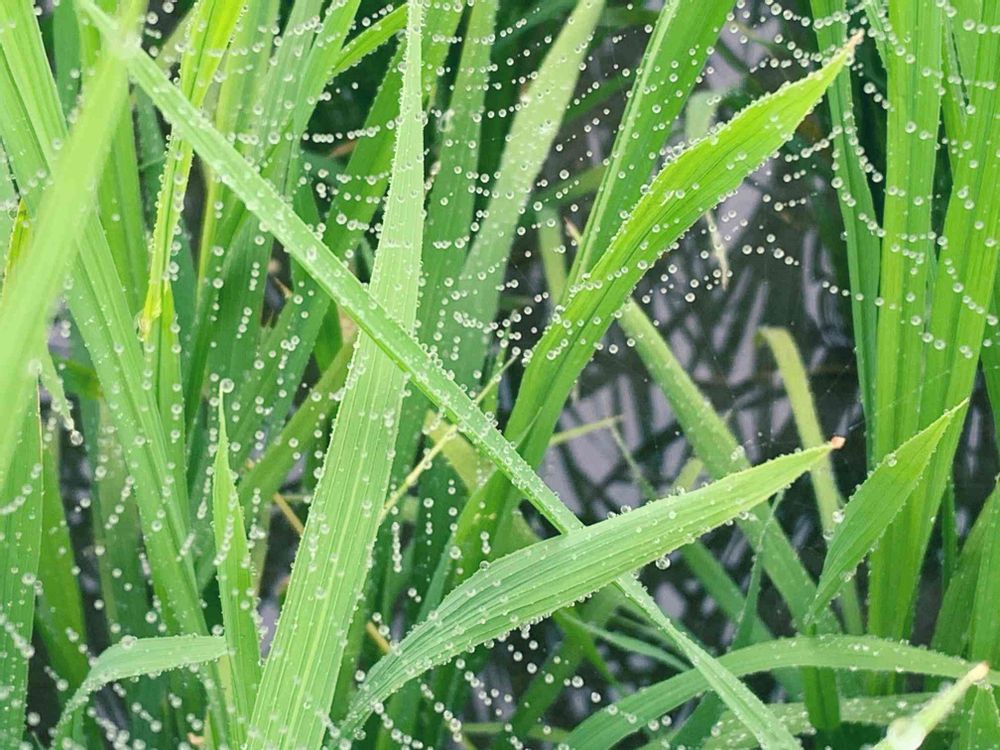 田んぼの稲にかかった、雨粒のレース✨