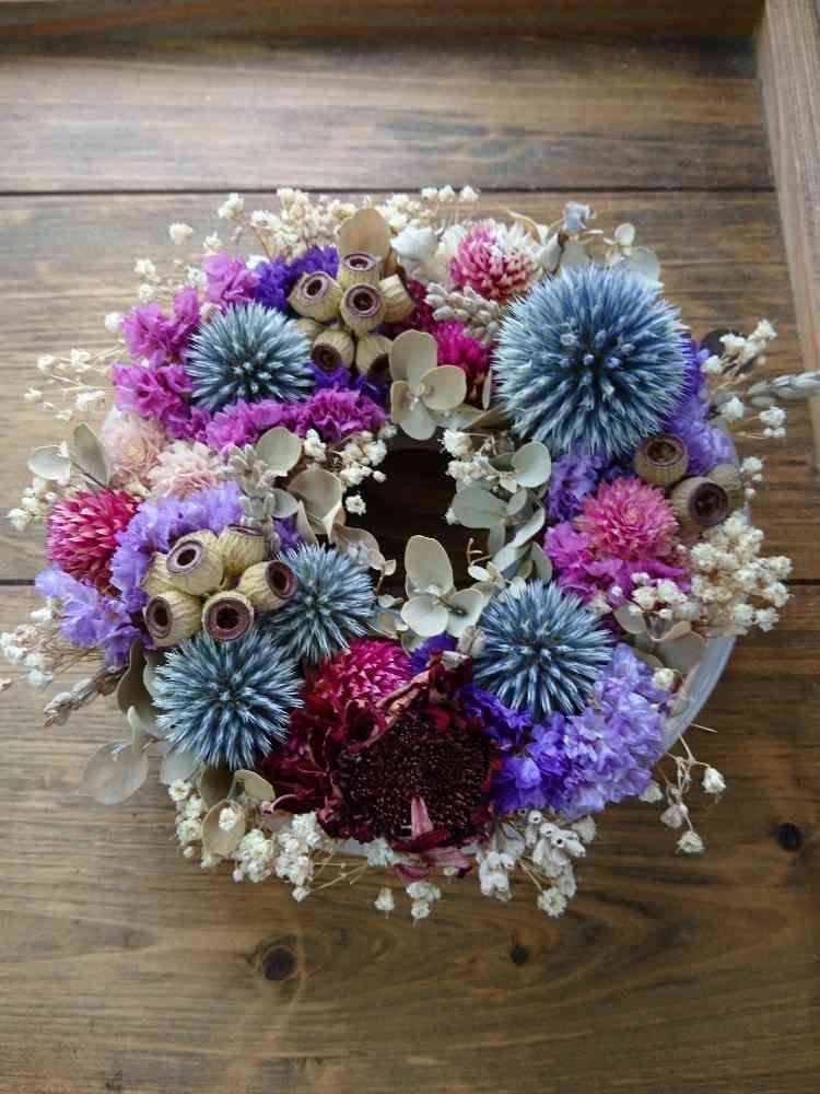 センニチコウは去年のです 色の残ってるのを使いました🎵 後 ルリタマアザミとスターチス❓はスーパーで買ってドライにしました🎵木の実だけ 花屋で買いましたよ(*^^*)ユーカリとかすみそうは友達からの頂き物をドライに(*^^*)