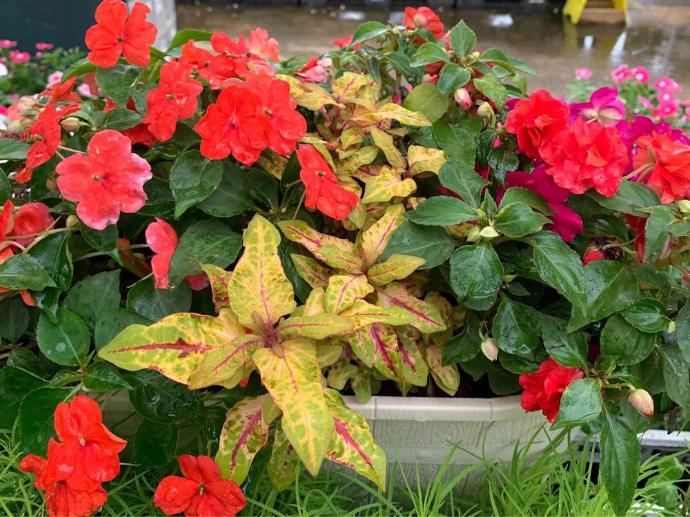 オレンジ🍊のインパチェンス、赤の八重咲きインパチェンス フィエスタ、向こう側には小粋なサンディの真ん中の線の色をした濃いピンクのインパチェンスも入っています。半日陰が好きな寄せ植えです☺️