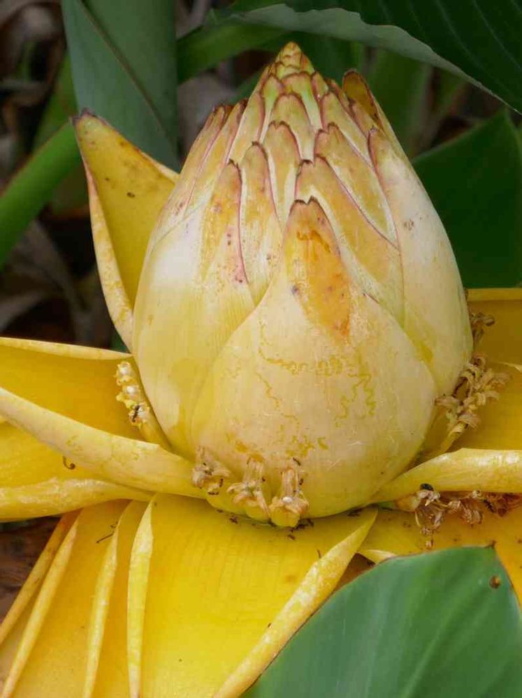 以前にも見かけたことがありますが、珍しい花を再び見つけました。「チユウキンレン(地湧金蓮)」です。漢字で「蓮」とありますが、「バショウ」の仲間。黄色い花びらに見えるのは苞葉で、本当の花は苞葉の下部にある部分。苞葉がめくれる度に花が咲き、約半年先続けるそうです。