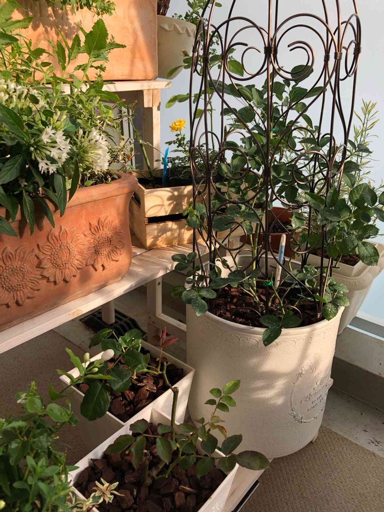 母上からピエールの挿木苗(2年目?)とケルビーノ1年生をもらいました。そしてレイニーブルーにオベリスク(ハンドメイドのものを購入)をつけました。週一の消毒と日々の葉っぱチェック頑張ります。