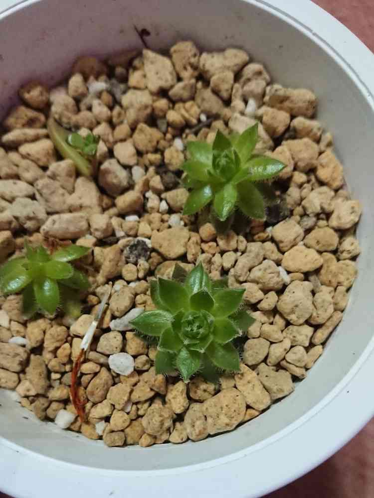 完全に根付いて育ってる赤ちゃん多肉(真ん中、右)です♪♪