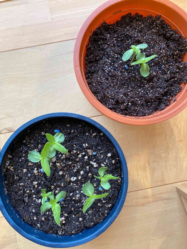 一番手前のふたつが、双葉も本葉も3枚ずつという不思議。。。。。